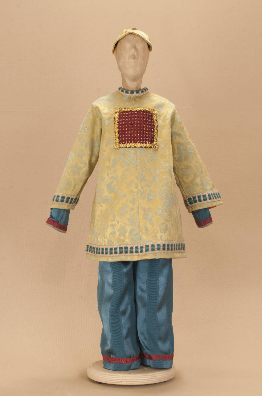 - NOTIZIE STORICO CRITICHE Si completa con scarpe. Il costume è stato realizzato per "La Lampada di Aladino", uno spettacolo che nasce come riduzione teatrale per marionette nel 1994. L¿argomento è tratto dalla fiaba "Aladino e la lampada meravigliosa", appendice della raccolta "Le Mille e Una Notte". Lo spettacolo di Eugenio Monti Colla, andato in scena in prima mondiale al Festival di Spoleto con musiche di Danilo Lorenzini, snoda il racconto in tredici quadri di ambientazione cinese come indicato nella fiaba d¿origine e narra l¿evoluzione del protagonista da giovinetto a uomo maturo attraverso vicende di carattere fantastico e simbolico.