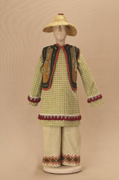 Costume da popolano cinese composto da pantaloni, veste, giubba e cappello.