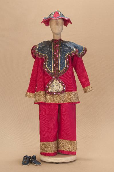 - NOTIZIE STORICO CRITICHE Il costume è stato realizzato per lo spettacolo "La Lampada di Aladino", che nasce come riduzione teatrale per marionette nel 1994. L¿argomento è tratto dalla fiaba "Aladino e la lampada meravigliosa", appendice della raccolta "Le Mille e Una Notte". Lo spettacolo di Eugenio Monti Colla, andato in scena in prima mondiale al Festival di Spoleto con musiche di Danilo Lorenzini, snoda il racconto in tredici quadri di ambientazione cinese come indicato nella fiaba d¿origine e narra l¿evoluzione del protagonista da giovinetto a uomo maturo attraverso vicende di carattere fantastico e simbolico.