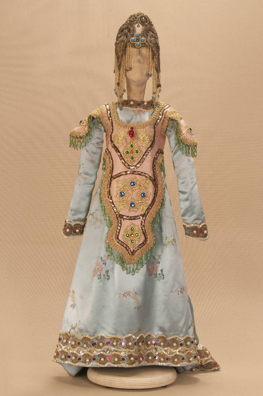 - NOTIZIE STORICO CRITICHE Si completa con scarpe. Il costume è stato realizzato per "La Lampada di Aladino", uno spettacolo che nasce come riduzione teatrale per marionette nel 1994. L¿argomento è tratto dalla fiaba "Aladino e la lampada meravigliosa", appendice della raccolta "Le Mille e Una Notte". Lo spettacolo di Eugenio Monti Colla, andato in scena in prima mondiale al Festival di Spoleto con musiche di Danilo Lorenzini, snoda il racconto in tredici quadri di ambientazione cinese come indicato nella fiaba d¿origine e narra l¿evoluzione del protagonista da giovinetto a uomo maturo attraverso vicende di carattere fantastico e simbolico.
