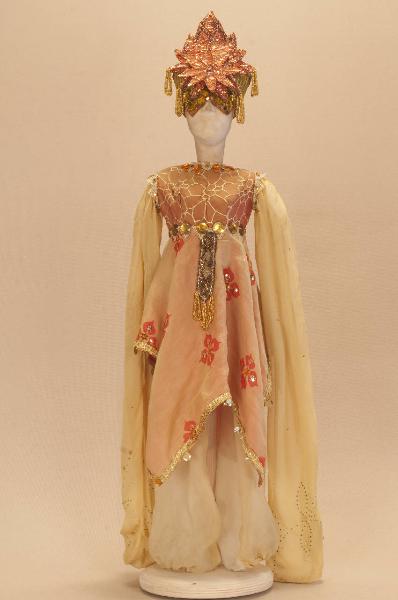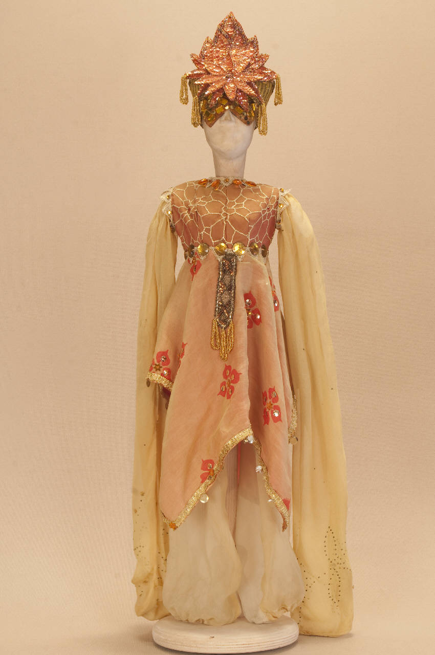 - NOTIZIE STORICO CRITICHE Il costume è stato realizzato per lo spettacolo "La Lampada di Aladino", che nasce come riduzione teatrale per marionette nel 1994. L¿argomento è tratto dalla fiaba "Aladino e la lampada meravigliosa", appendice della raccolta "Le Mille e Una Notte". Lo spettacolo di Eugenio Monti Colla, andato in scena in prima mondiale al Festival di Spoleto con musiche di Danilo Lorenzini, snoda il racconto in tredici quadri di ambientazione cinese come indicato nella fiaba d¿origine e narra l¿evoluzione del protagonista da giovinetto a uomo maturo attraverso vicende di carattere fantastico e simbolico.