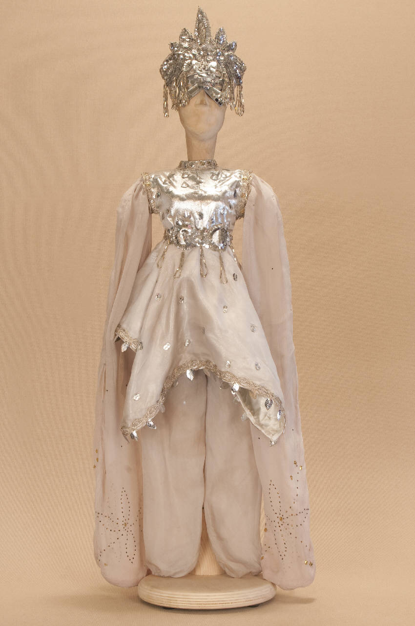 - NOTIZIE STORICO CRITICHE Il costume è stato realizzato per lo spettacolo "La Lampada di Aladino", che nasce come riduzione teatrale per marionette nel 1994. L¿argomento è tratto dalla fiaba "Aladino e la lampada meravigliosa", appendice della raccolta "Le Mille e Una Notte". Lo spettacolo di Eugenio Monti Colla, andato in scena in prima mondiale al Festival di Spoleto con musiche di Danilo Lorenzini, snoda il racconto in tredici quadri di ambientazione cinese come indicato nella fiaba d¿origine e narra l¿evoluzione del protagonista da giovinetto a uomo maturo attraverso vicende di carattere fantastico e simbolico.