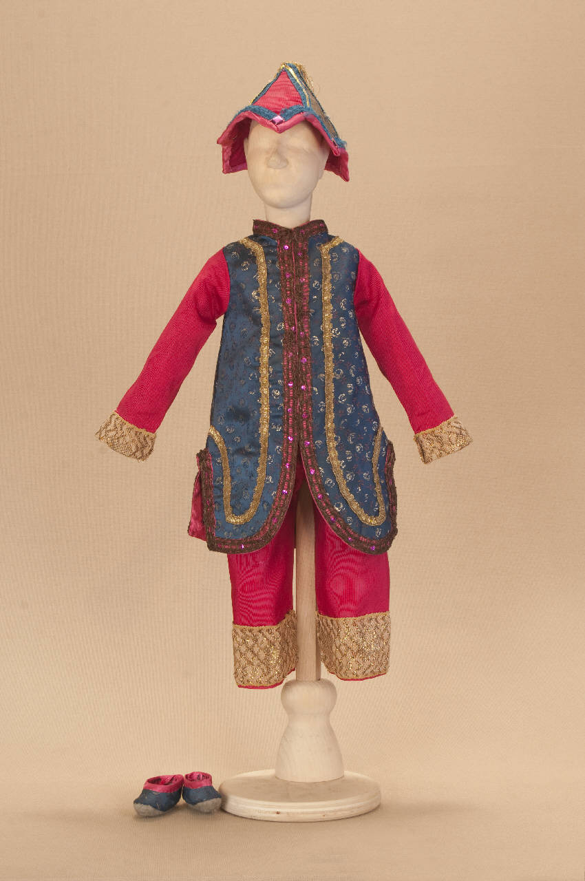 - NOTIZIE STORICO CRITICHE Il costume è stato realizzato per lo spettacolo "La Lampada di Aladino", che nasce come riduzione teatrale per marionette nel 1994. L¿argomento è tratto dalla fiaba "Aladino e la lampada meravigliosa", appendice della raccolta "Le Mille e Una Notte". Lo spettacolo di Eugenio Monti Colla, andato in scena in prima mondiale al Festival di Spoleto con musiche di Danilo Lorenzini, snoda il racconto in tredici quadri di ambientazione cinese come indicato nella fiaba d¿origine e narra l¿evoluzione del protagonista da giovinetto a uomo maturo attraverso vicende di carattere fantastico e simbolico.