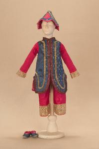Costume da bambino orientale composto da pantaloni, veste, scarpe e cappello.