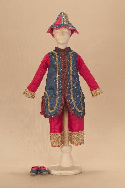 Costume da bambino orientale composto da pantaloni, veste, scarpe e cappello.