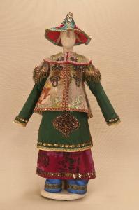 - NOTIZIE STORICO CRITICHE Si completa con scarpe. Il costume è stato realizzato per lo spettacolo "La Lampada di Aladino", che nasce come riduzione teatrale per marionette nel 1994. L¿argomento è tratto dalla fiaba "Aladino e la lampada meravigliosa", appendice della raccolta "Le Mille e Una Notte". Lo spettacolo di Eugenio Monti Colla, andato in scena in prima mondiale al Festival di Spoleto con musiche di Danilo Lorenzini, snoda il racconto in tredici quadri di ambientazione cinese come indicato nella fiaba d¿origine e narra l¿evoluzione del protagonista da giovinetto a uomo maturo attraverso vicende di carattere fantastico e simbolico.