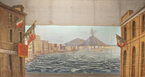 Scenografia in carta, fortezzata con strisce di tessuto di cotone, dipinta ad acqua e composta da un fondale e un principale.