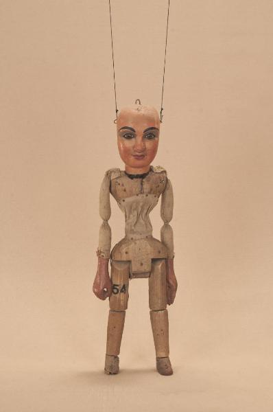 Testa in legno di tiglio fissata al corpo tramite ferro; occhi di vetro bloccati con gesso; corpo in pioppo tagliato e fissato con molle d'acciaio; gambe in pioppo attaccate con ferro al bacino; ginocchia ad incastro e piedi fissi; mani in tiglio fisse, a spatola la sinistra e a pugno chiuso la destra.