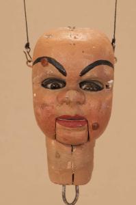 Testa in legno di tiglio; innesto occhi di vetro mobili; bocca mobile; inserimento anello in ferro per fissaggio sul corpo. Dipintura con colori ad olio; chiusura con pelle della parte posteriore della testa.