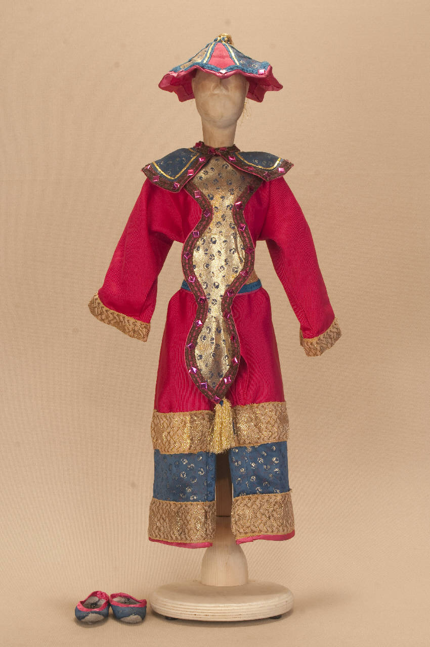 - NOTIZIE STORICO CRITICHE Il costume è stato realizzato per lo spettacolo "La Lampada di Aladino", che nasce come riduzione teatrale per marionette nel 1994. L¿argomento è tratto dalla fiaba "Aladino e la lampada meravigliosa", appendice della raccolta "Le Mille e Una Notte". Lo spettacolo di Eugenio Monti Colla, andato in scena in prima mondiale al Festival di Spoleto con musiche di Danilo Lorenzini, snoda il racconto in tredici quadri di ambientazione cinese come indicato nella fiaba d¿origine e narra l¿evoluzione del protagonista da giovinetto a uomo maturo attraverso vicende di carattere fantastico e simbolico.