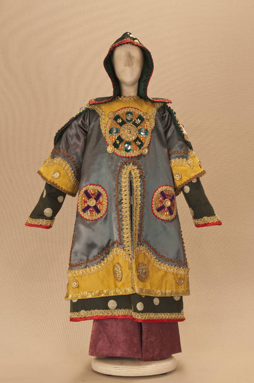 - NOTIZIE STORICO CRITICHE Si completa con elmo e stivaletti. Il costume è stato realizzato per lo spettacolo "La Lampada di Aladino", che nasce come riduzione teatrale per marionette nel 1994. L¿argomento è tratto dalla fiaba "Aladino e la lampada meravigliosa", appendice della raccolta "Le Mille e Una Notte". Lo spettacolo di Eugenio Monti Colla, andato in scena in prima mondiale al Festival di Spoleto con musiche di Danilo Lorenzini, snoda il racconto in tredici quadri di ambientazione cinese come indicato nella fiaba d¿origine e narra l¿evoluzione del protagonista da giovinetto a uomo maturo attraverso vicende di carattere fantastico e simbolico.
