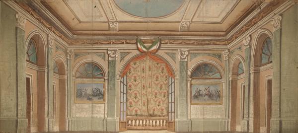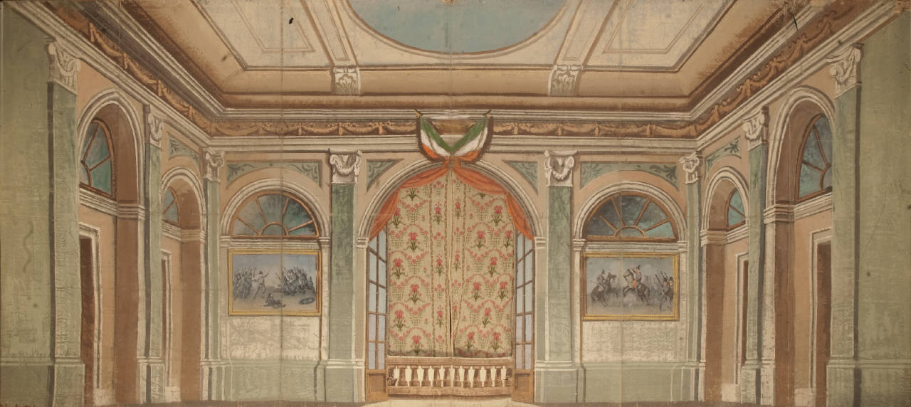 Scenografia in carta, fortezzata con strisce di tessuto di cotone, dipinta ad acqua e composta da un solo fondale con applicazione delle tende in tessuto di cotone a fantasia stampata