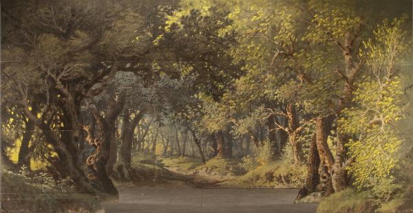 Scenografia in carta, fortezzata con strisce di tessuto di cotone, dipinta ad acqua e composta da un fondale e due principali.