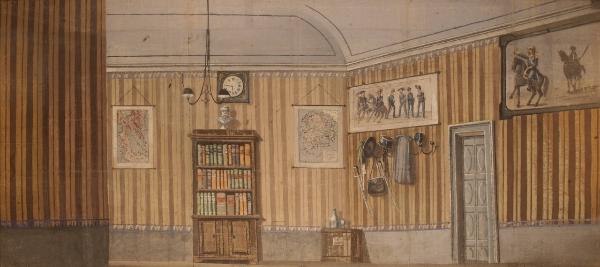 Scenografia in carta, fortezzata con strisce di tessuto di cotone, dipinta ad acqua e composta da un solo fondale.