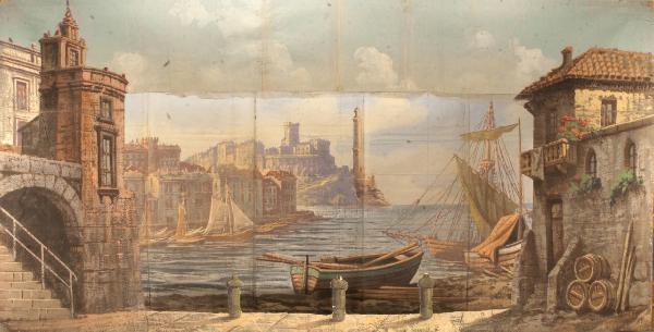 Scenografia in carta, fortezzata con strisce di tessuto di cotone, dipinta ad acqua e composta da un fondale e un principale.
