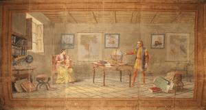 Sipario in carta, fortezzato con strisce di tessuto di cotone, dipinto ad acqua .
