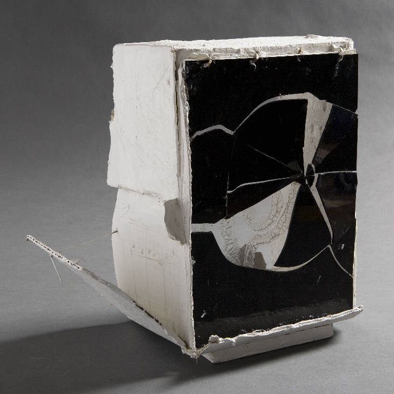 Cella sedici, spazio mistico consistente in un alta scatola rettangolare, aperta frontalmente e chiusa al verso da una lastra di vetro soffiato trasparente, sulla quale sono stati incollati frammenti di vetro scuro che con lo spesso strato di colla trasparente creano un motivo decorativo, una sorta di sole. Al centro sagoma lanceolata in cartone bianco e filo disposto in obliquo. Esternamente, sul fianco sinistro, sono inseriti tre chiodi con filo bianco attorcigliato e su quello destro una porzione aggiuntiva di cartone disposto obliquamente e trattenuto da un ferro sottile.\nLa cella è conservata all'interno di una teca in plexiglass.