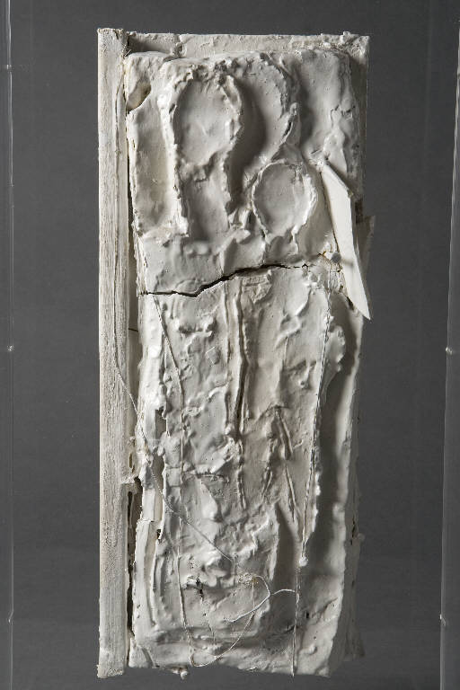 Forma bianca, consistente in due figure affiancate, di cui quella a destra più bassa e protetta da un frammento di vetro antico soffiato, inserito nella creta. Fili diffusi, chiodi e piccoli frammenti di vetri sparsi. Le figure sono inserite all'interno di un pannello ligneo dotato di un bordo a sinistra. Il verso è stato lasciato a legno naturale, con tracce di compensato e di colla.\nLa Forma Bianca è attualmente conservata all'interno di una teca in plexiglass.