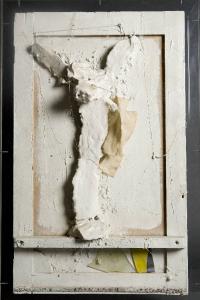 Forma bianca, entro un'antina lignea di recupero tinta in bianco opaco, si staglia il Cristo in croce, con il capo reclinato in avanti, da cui parte un ferro che regge un drappo impregnato di vinavil. Sul fondo piccoli sassi tinti di bianco, chiodi e fili di refe. Nella porzione basa della composizione, una sorta di predella, si innestano tre frammenti di vetro antico soffiato, giallo, nero e trasparente.\nLa Forma Bianca è attualmente conservata all'interno di una teca in plexiglass.