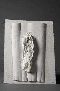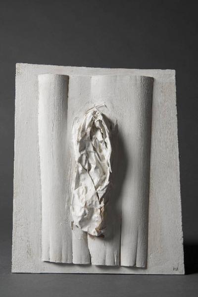 Forma bianca, tavoletta in compensato tinteggiato in bianco opaco con applicato un foglio sottile di legno impiallacciato e ondulato. Al centro è fissata una carta accartocciata, imbevuta nel vinavil e tinta in bianco. Al verso, al centro è traccito un cerchio con un pennarello verde e alla base data e scritta.
