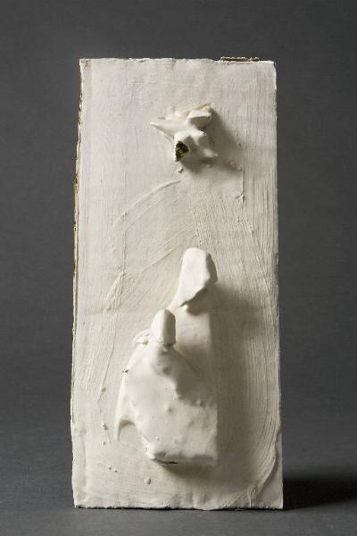 Forma bianca, da una formella a rilievo emergono, fortemente rilevati, una Madonna con Bambino in fasce, sormontato da una stella stilizzata e aggettante. Il rilievo in gesso è stato coperto da uno spesso strato di colore bianco opaco, steso a spatola.\nAl verso si conserva l'etichetta adesiva della scatola originaria utilizzata "Cibachrome process P.10".