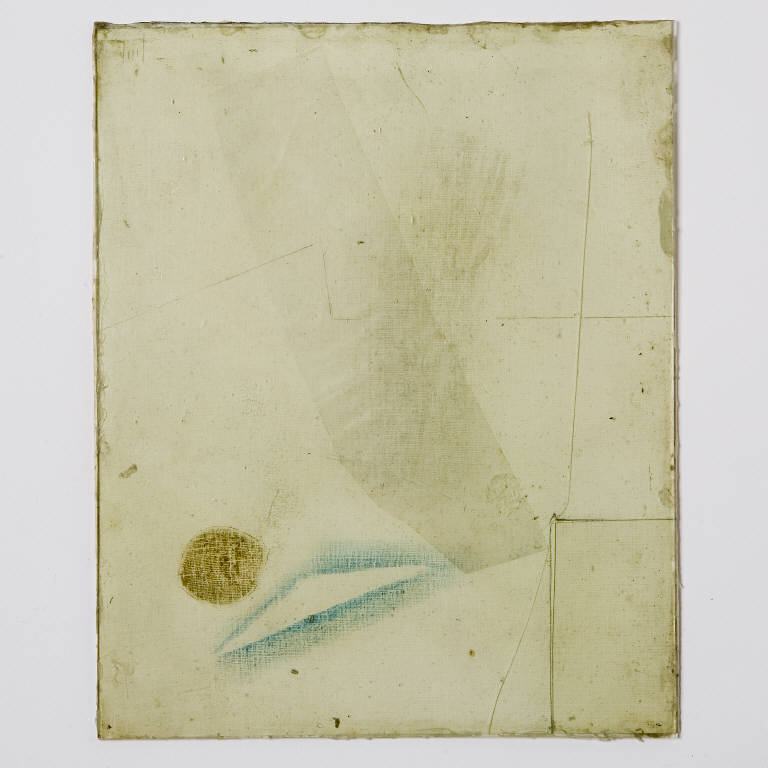 Formella quadrata di piccole dimensioni su cartoncino. La composizione è dominata da un triangolo blu dormontato da un clipeo beige e da uno di dimensioni minori abraso volutamente. Filo disposto in verticale e pellicola trasparente in plastica completano l'opera. Nell'angolo in basso a destra è stato ricavato un rettangolo, asportando una porzione di cartoncino, questa forma geometrica è stata recuperata e incollata simmetricamente al verso. Anteriormente la composizione in tecnica mista è protetta da un vetro antico soffiato, di recupero. Al verso etichetta cartacea bianca con un vecchio numero d'inventario in pennarello rosso 3261, sostituito da n. 22.