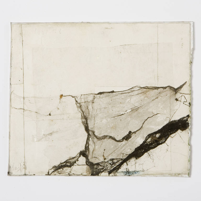 Formella quadrata di piccole dimensioni su cartoncino, con composizione a tecnica mista, protetta anteriormente da un vetro antico soffiato, di recupero. La composizione, caratterizzata da più strati di cartoncini di vari formati, reca al centro una vistosa ragnatela con ragno incorporato, protetto parzialmente da una pellicola trasparente in plastica, quindi dal vetro. Al verso più riquadri di cartoncino, di cui uno profilaro in colore azzurro, con abrasioni sparse create dall'artista in più punti.