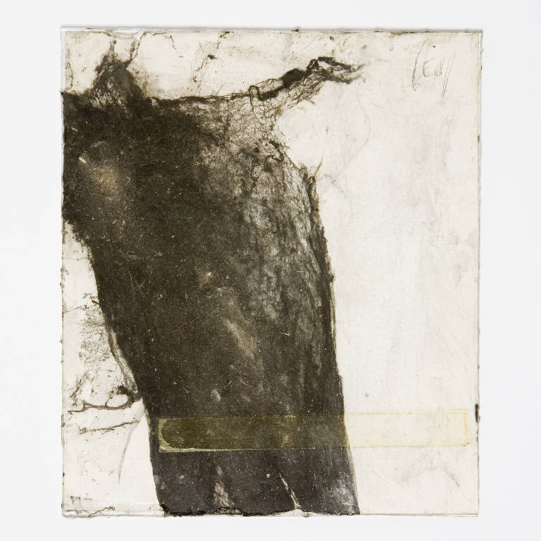 Formella quadrata di piccole dimensioni su cartoncino, con composizione a tecnica mista, protetta anteriormente da un vetro antico soffiato, di recupero. \nIl cartoncino usato come fondo è ricoperto da uno spesso strato di biacca e abraso in alcuni punti. Sul lato sinistro della composizione si dispone una vistosa ragnatela. In basso al centro è incollato un pezzo di nastro adesivo. Al verso è applicata una porzione rettangolare di cartoncino.