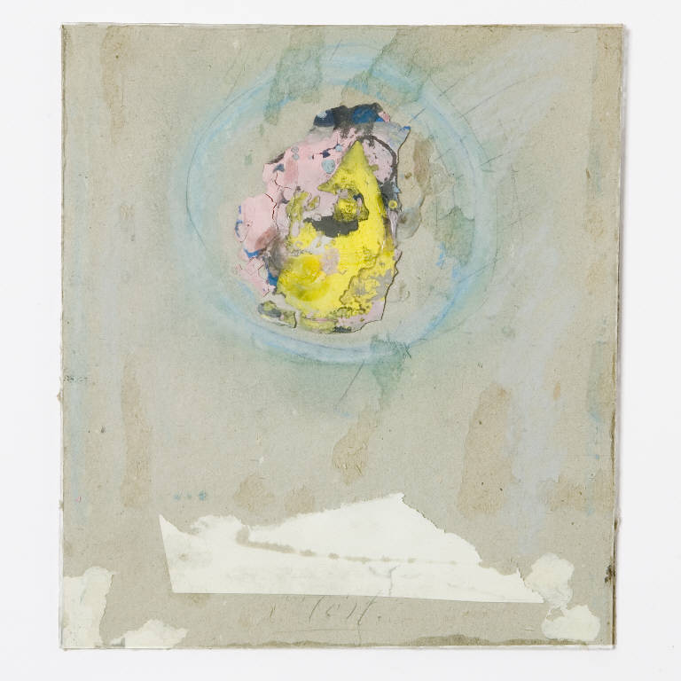 Formella quadrata di piccole dimensioni su cartoncino, con composizione a tecnica mista, protetta anteriormente da un vetro antico soffiato, di recupero. Il cartoncino usato come fondo risulta volutamente abraso in alcuni punti e connotato da uno spesso strato di colore nella porzione superiore centrale, dove si staglia un clipeo-sole reso mediante la stesura di un alone azzurro all'esterno e policromo al centro. Il nucleo del sole presenta infatti uno spesso strato materico che mescola i colori giallo, rosa, nero e azzurro. In basso frammenti di carta bianca.