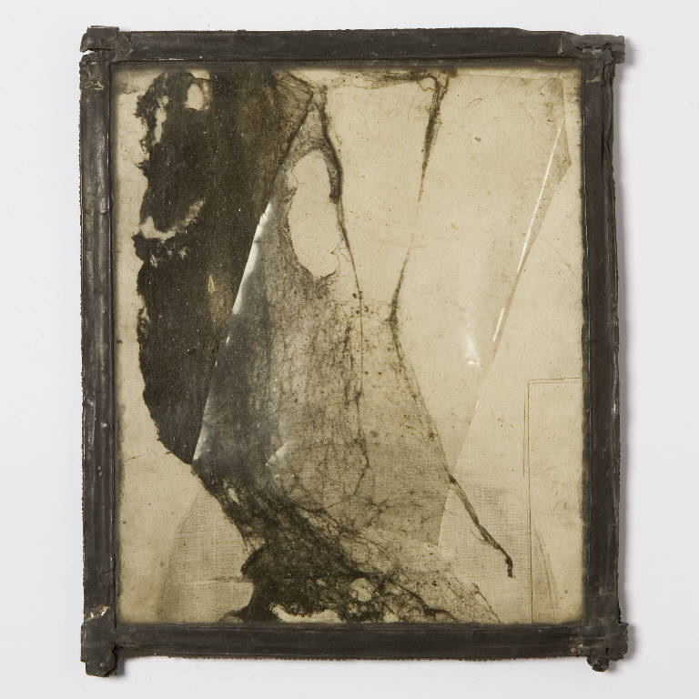 Formella quadrata di piccole dimensioni su cartoncino, con composizione a tecnica mista, protetta anteriormente da un vetro antico soffiato, di recupero. Il Trasparente è inserito in una cornice creata da piombo antico. Al centro vistosa ragnatela scura, parzialmente coperta da un rettangolo in plastica trasparente\nAl verso il cartoncino presenta a sinistra un lungo rettangolo di cartone ritagliato ed incollato.