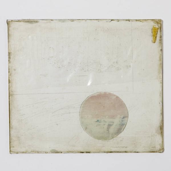 Formella quadrata di piccole dimensioni su cartoncino, con composizione a tecnica mista, protetta anteriormente da un vetro antico soffiato, di recupero. \nSulla superficie del cartoncino, è realizzato, nella porzione bassa, un clipeo rilevato trasparente in silicone che copre un ulteriore tondo dipinto con colore rosso nella parte superiore della composizione e azzurro in quella inferiore, compreso tra sottili tratteggi a lapis. Nella porzione superiore, riquadro a lapis con sequenza di incisioni verticali parallele e traccia di colore bianco. A destra, un triangolo giallo, in basso a destra piccolo quadrato inciso.