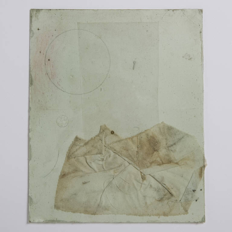 Formella quadrata di piccole dimensioni su cartoncino, con composizione a tecnica mista, protetta anteriormente da un vetro antico soffiato, di recupero. \nAl centro e nella porzione inferiore della composizione è collocata una porzione di tela bianca, alla cui sinistra è adagiato un capello disposto ad arco. Più sopra è tracciato e inciso un rettangolo con un clipeo volutamente abraso disposto a sinistra. Al centro un grosso frammento di plastica trasparente è disposto in verticale. In alto a sinistra un ulteriore cerchio a matita, con una leggera colorazione rossa.