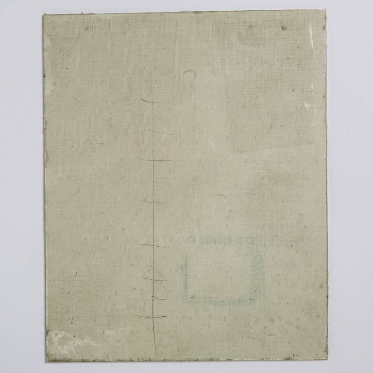 Formella quadrata di piccole dimensioni su cartoncino, con composizione a tecnica mista, protetta anteriormente da un vetro antico soffiato, di recupero. \nAl centro della composizione è realizzata a lapis una linea verticale con tacche; nella porzione inferiore a destra un quadrato dal perimetro azzurro; in alto a destra un rettangolo in plastica trasparente. Al verso, al centro una porzione rettangolare di cartoncino con abrasioni create dall'artista.
