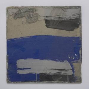 Formella quadrata di piccole dimensioni su cartoncino, con composizione a tecnica mista, protetta anteriormente da un vetro antico soffiato, di recupero. \nAl centro della composizione, realizzata mediante l'utilizzo di due cartoncini di recupero affiancati, spicca una stesura di un vivace colore blu-azzurro con rettangolo nero, parzialmente coperto da una stesura più ampia di grigio chiaro, steso sul vetro. Nella porzione superiore, a destra, chiazza nera con stesura di grigio chiaro sovrapposto e a sinistra groviglio di fili e colori. Un trapezio in plastica trasparente a destra.\nAl verso, due cartoncini di recupero "Astronomia" (Armando Curcio Editore. Astronomia. Alla scoperta del cielo) con spessa stesura di colore nero opaco che lascia però scoperto il bordo perimetrale bianco. Al verso un'etichetta rettangolare in carta bianca adesiva con il numero d'inventario 2749 in pennarello nero e sopra, depennato da due righe nere, il vecchio numero d'inventario 3274 a pennarello rosso.