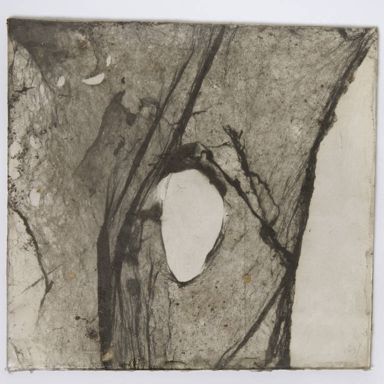 Formella quadrata di piccole dimensioni su cartoncino, con composizione a tecnica mista, protetta anteriormente da un vetro antico soffiato, di recupero. \nUna vistosa ragnatela scura occupa, creando un'apertura ovale al centro, la superficie di fondo che appare costituita da due cartoncini ritagliati e affiancati. Inseriti nella composizione piccoli ragnetti e grumi di polvere. L'estremo lato destro, libero, non risulta coperto dalla ragnatela.\nAl verso cartoncino bianco intero, sul quale insistono un'etichetta rettangolare in carta bianca adesiva con il numero d'inventario 2750 in pennarello nero e sotto un'etichetta con il vecchio numero d'inventario 3274 a pennarello rosso.