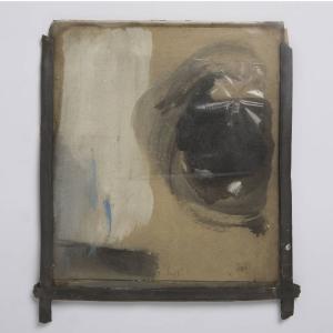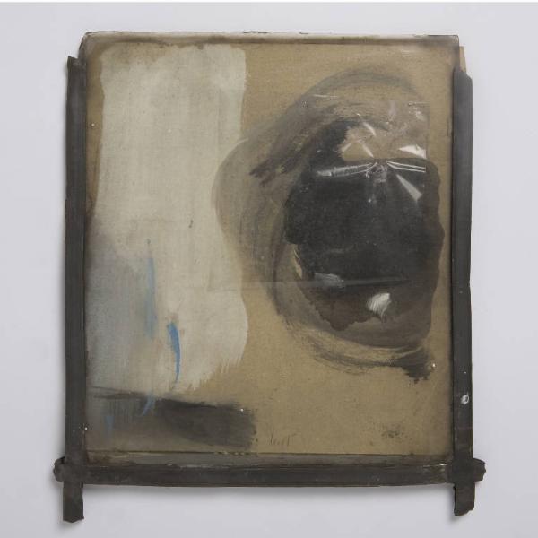 Formella quadrata di piccole dimensioni su cartoncino, con composizione a tecnica mista, protetta anteriormente da un vetro antico soffiato, di recupero. \nUnico cartone beige connotato da una vistosa macchia di colore nero con lumeggiature bianche che campeggia a destra, protetta da un frammento di plastica trasparente. A sinistra un grosso rettangolo bianco reca sottili pennellate azzurre e poggia su una stesura di colore nero. La composizione è compresa, su tre lati, entro una cornice a piombo realizzata con materiale di recupero.\nAl verso, tre cartoni di recupero assemblati e tinti di nero opaco. Al verso un'etichetta rettangolare in carta bianca adesiva con il numero d'inventario 2755 in pennarello nero, ne copre un'altra con il vecchio numero 3300 a pennarello rosso, depennato da due righe nere.