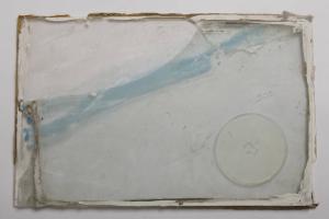 Formella quadrata di piccole dimensioni su cartoncino, con composizione a tecnica mista, protetta anteriormente da un vetro antico soffiato, di recupero. \nIl Trasparente, di dimensioni maggiori rispetto agli altri di formato standard quadrato, presenta un grosso vetro rettangolare con dipinta una vistosa onda azzurra con lievi pennellate bianche. \nAl verso, nell'angolo in basso a destra, un grosso frammento di vetro, con vistosa lacuna voluta dall'artista . Tra i due vetri si inserisce un ampio clipeo trasparente e rilevato in silicone in alto a destra; tracce diffuse di biacca e di silicone. I due vetri sono tenuti assieme da uno spesso strato di silicone e da frammenti di crrtoncino presenti lungo quasi tutto il perimetro (solo a detra il cartoncino manca).