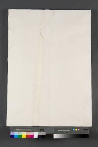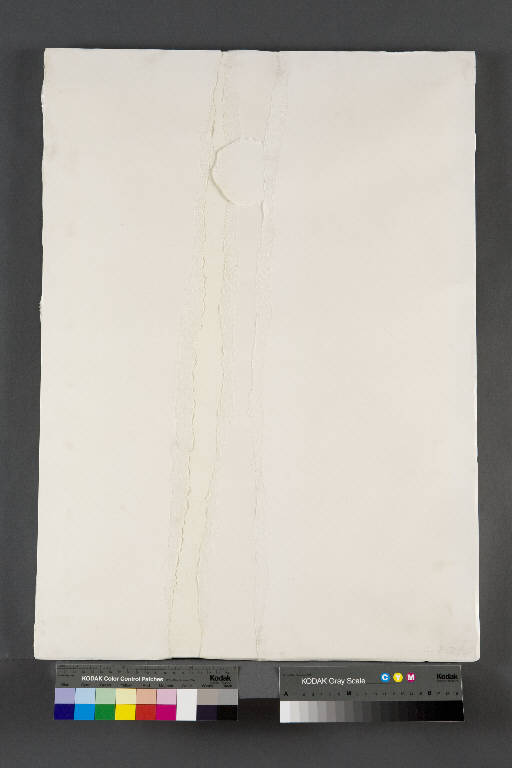 Collage in cartoncino, al cui centro, tra due ampi margini bianchi e lisci, si inseriscono verticalmente più strati di carta bianca dai margini frastagliati e abrasi; nella porzione superiore è inserito un piccolo clipeo. I bordi della tela, fissata a telaio ligneo con tasselli angolari, sono tinti in bianco.
