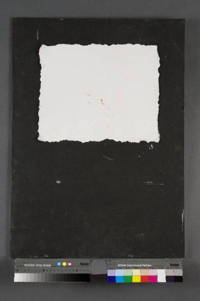 Collage. Su una tavola di compensato rettangolare, tinta di nero, è incollato nella porzione sinistra un cartoncino bianco di forma rettangolare, dai bordi frastagliati. Al verso una lunga linea tracciata con silicone è disposta a formare il perimetro di un rettangolo.