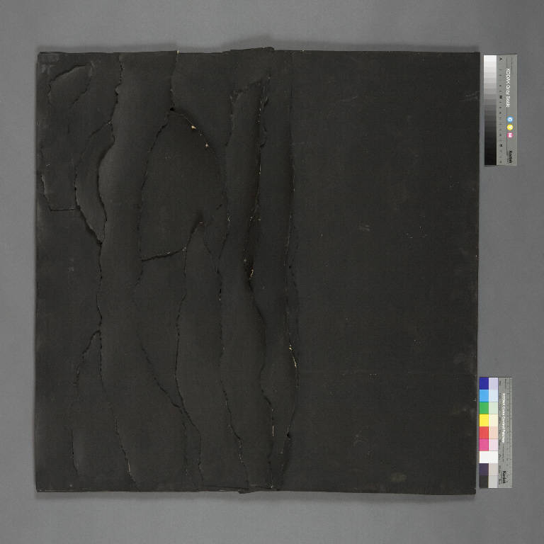 La composizione a collage di forma quadrata è interamente realizzata in nero. Superiormente un'ampia porzione di tela liscia è tinta di nero, inferiormente numerose fasce di carta nera dai bordi frastagliati e ondulati si dispongono orizzontalmente, creando una sorta di mare increspato da onde, dal quale emerge, da sinistra, un enorme clipeo nero dal perimetro non ben definito.