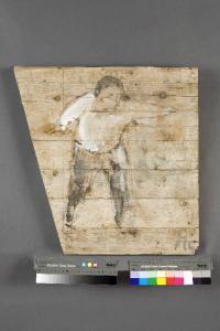 Al centro di una spessa tavola lignea di recupero, è delineata una figura virile nell'atto di compiere un passo, con le braccia allargate e camicia bianca.