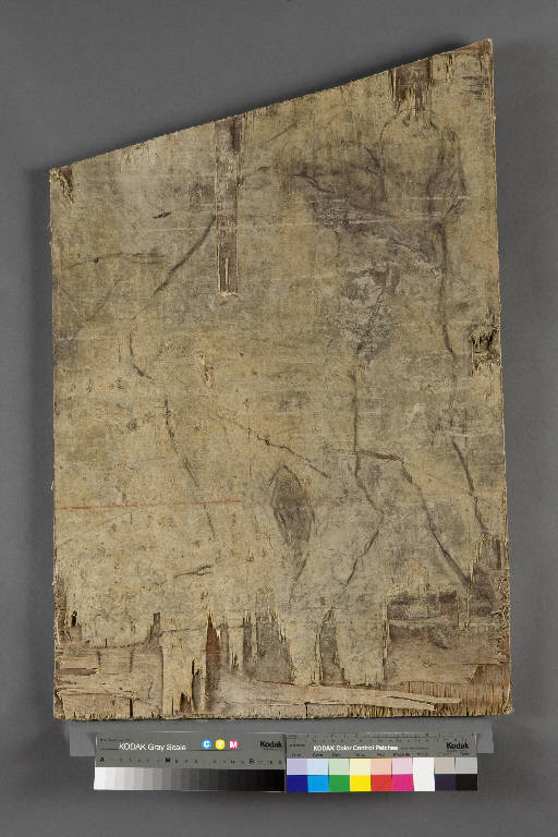 Studio di figura virile resa con pochi tratti a carboncino, raffigurata con un braccio alzato nell'atto di prendere una sfera incisa sopra la testa. La figura è tratteggiata su di una spessa tavola lignea di recupero. In alto sul bordo è fissato un rudimentale gancio in ferro.