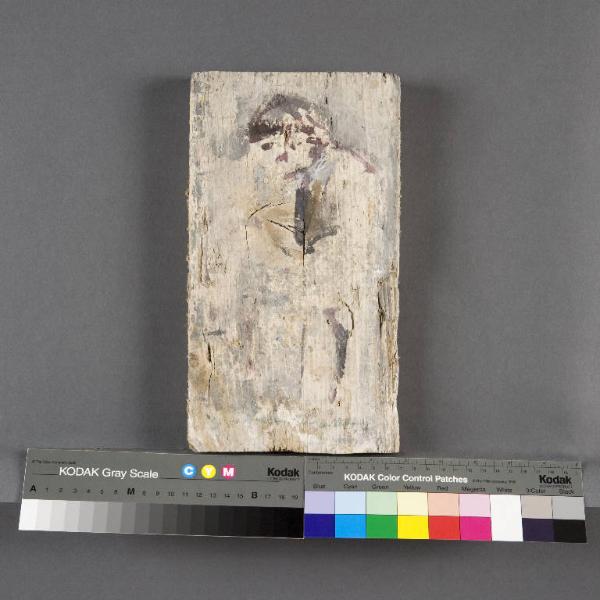 Su una spessa tavola lignea di recupero, l'artista ha delineato, con pochi veloci tratti di color porpora, una figura stante.