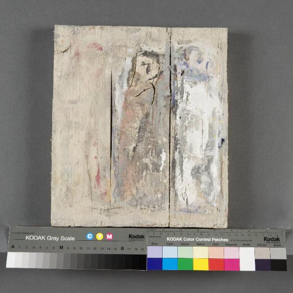 Studio di figure. Su una tavola lignea di recupero sono delineate a tempera policroma e carboncino tre figure intere, rese con veloci tratti.