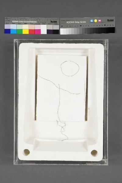 Entro un contenitore di polistirolo di riutilizzo, tinto di bianco, si inserisce una piccola tavola lignea anch'essa tinteggiata di bianco, sulla quale è disposto un filo nero a formare uno stilizzato Cristo in croce.