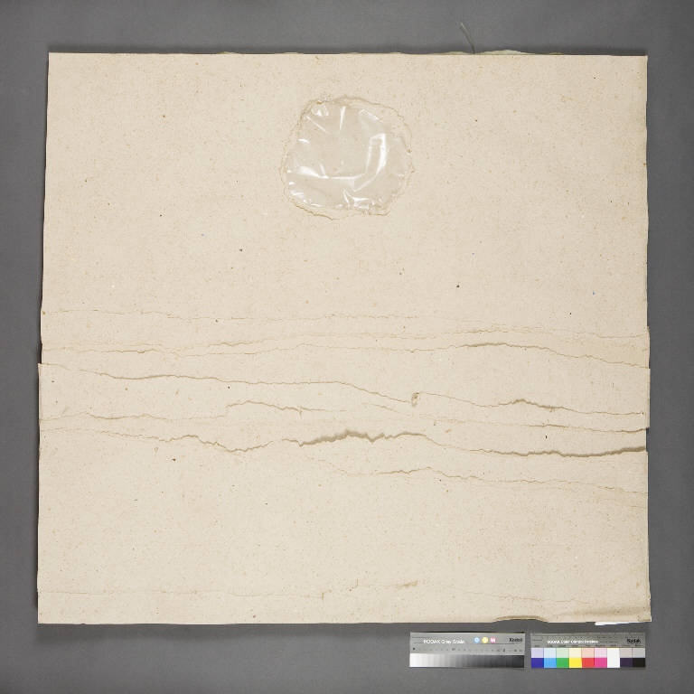Sulla superficie bianca della tela quadrata si dispongono più fasce di cartoncino beige, dai margini non ben definiti, per dare l'idea di un terreno arato. Nella porzione superiore, al centro, un clipeo in cartoncino, rivestito da un ulteriore cerchio in cellophan. Il cartoncino, sovrapposto alla tela fissata su telaio ligneo, fuoriesce, per volere dell'artista, di 7 cm dal supporto sottostante.