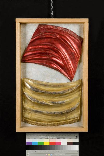 Entro una semplice cornice, con legno lasciato rustico, sono assemblate porzioni decorative di antiche balaustre, ridipinte con colori accesi e cangianti. Sul fondo argentato della composizione si stagliano nella porzione inferiore un drappo ligneo dorato sfrangiato e fiori a puzone e nella porzione superiore un drappo rosso disposto in obliquo.