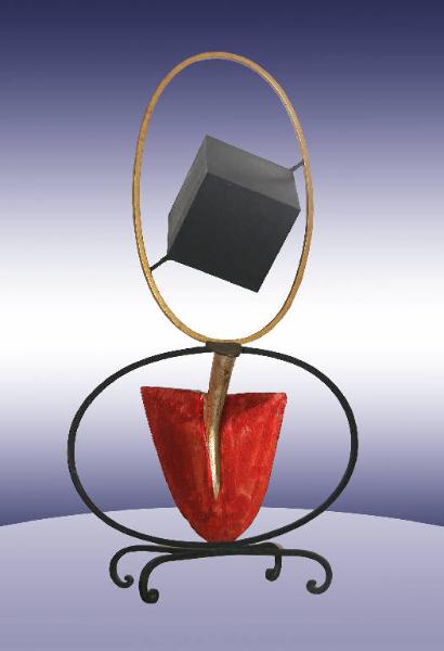Entro un ampio anello ovale dorato, sta sospeso un cubo nero rotante, a sua volta poggiante su un ovale nero, disposto in orizzontale e concluso da quattro piedini a voluta, al centro del quale si inserisce un badile tinto, di rosso su un verso e dorato sull'altro, finito da una maniglia in ottone.
