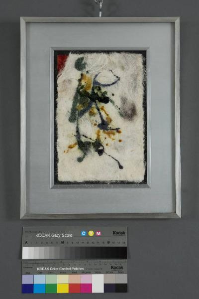 Personaggio stilizzato policromo, tratteggiato su lana grezza, disposta su tavola lignea laccata in rosso. Cornice argentea.