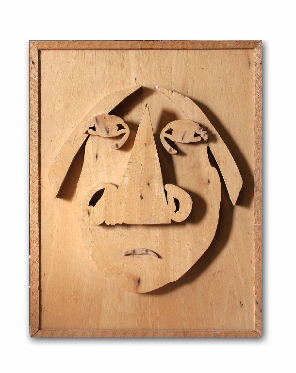 Prototipo raffigurante un volto stilizzato, realizzato in legno intagliato, applicato su un fondo in abete naturale con cornice grezza a listello.